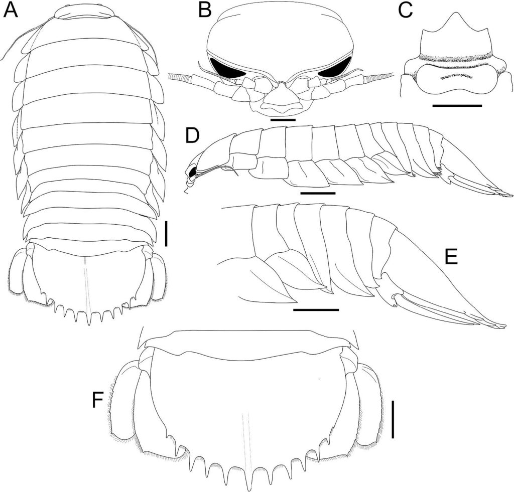 Macho de la especie Bathynomus vaderi. A: vista dorsal; B: vista anterior del cefalón; C: región clipeal; D: vista lateral del cuerpo; E: vista lateral del pereón; F: pleotelson. Imagen: Zookeys.